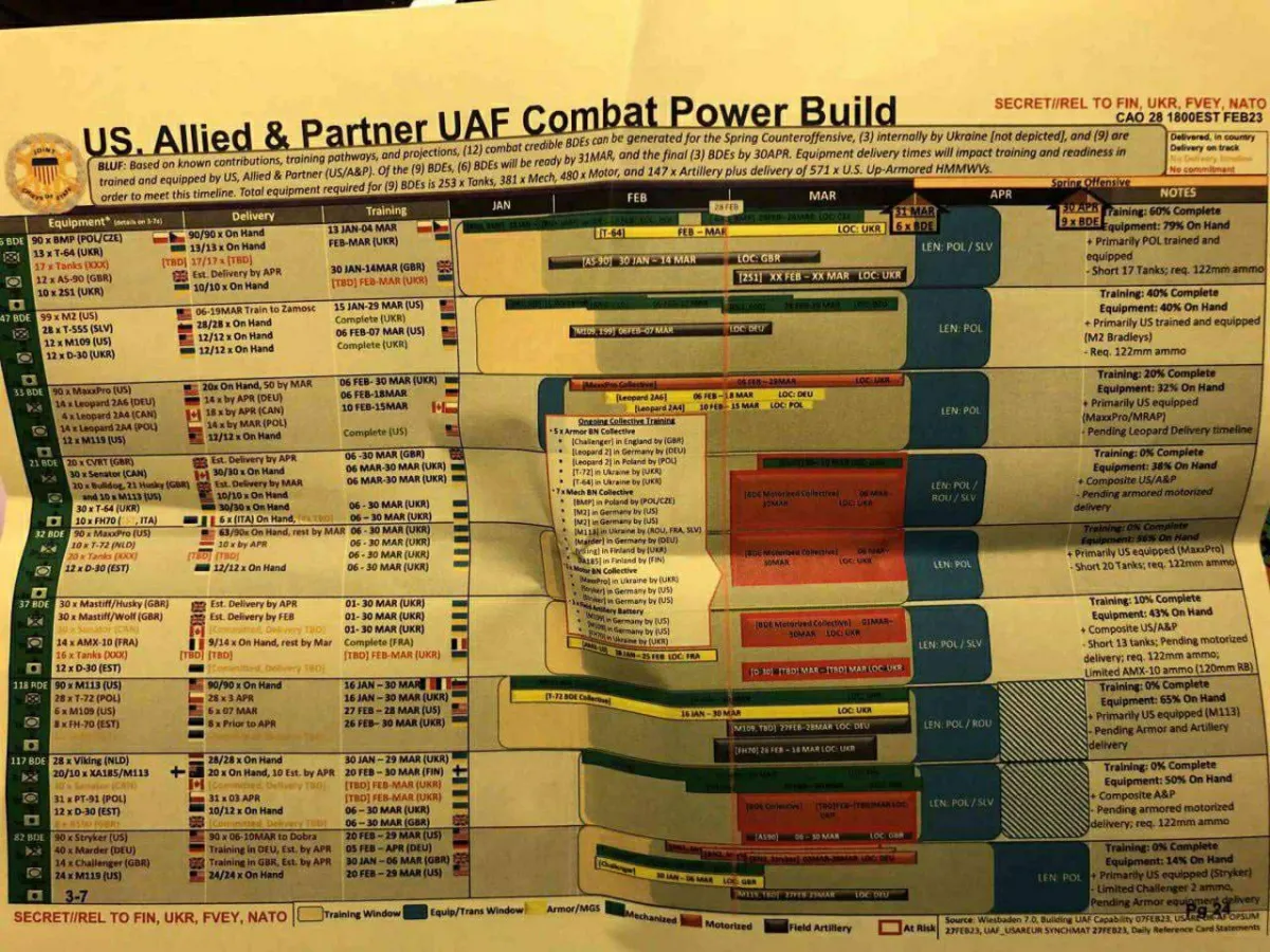 Φωτογραφίες αρκετών δεκάδων σελίδων απόρρητων εγγράφων, οι οποίες φαίνεται να έχουν τυπωθεί και μετά να έχουν τοποθετηθεί σε ένα αρχείο, δημοσιοποιήθηκαν στις 28 Φεβρουαρίου και στις 2 Μαρτίου, σε μία δημοφιλή πλατφόρμα chat με παιχνίδια. Τα έγγραφα δημοσιοποιήθηκαν από έναν χρήστη σε έναν διακομιστή με το όνομα «Wow Mao».