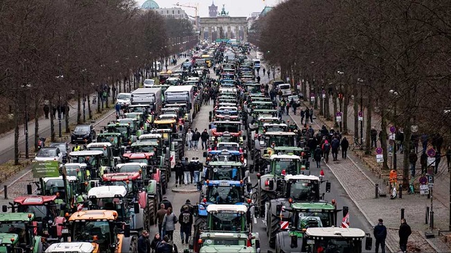 Κομβόι τρακτέρ και φορτηγά, κάποια με πανό διαμαρτυρίας που έγραφαν «χωρίς αγρότες, χωρίς τρόφιμα, χωρίς μέλλον», έκαναν την εμφάνισή τους στους γερμανικούς δρόμους σε θερμοκρασίες υπό το μηδέν. Στο Βερολίνο, μια σειρά από δεκάδες τρακτέρ απέκλεισε την κεντρική λεωφόρο που οδηγεί στην Πύλη του Βρανδεμβούργου.